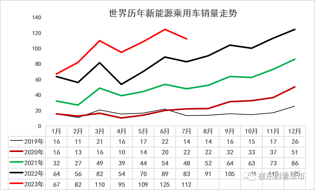 2021-2022年呈现加速上升态势,低基数下的增长更强。2023年世界新能源车起步较低,7月基本恢复强势高增长。